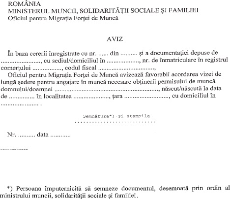 Acestea sunt documentele necesare pentru angajarea cetățenilor străini într-o țară, cum ar fi România. Avizul de angajare pentru un lucrător permanent este necesar pentru obținerea vizei în vederea venirii în România, în scopul angajării în muncă la o persoană juridică din România. De asemenea, avizul de angajare este necesar să se obțină de către angajatorul care dorește să încadreze în muncă un cetățean străin cu drept de ședere valabil pe teritoriul României, în cazul schimbării angajatorului sau a funcției la același angajator. Aceste avize de angajare atestă dreptul unei persoane străine de a lucra legal în România, fiind emise de autoritățile competente, respectiv Inspectoratul General pentru Imigrări.